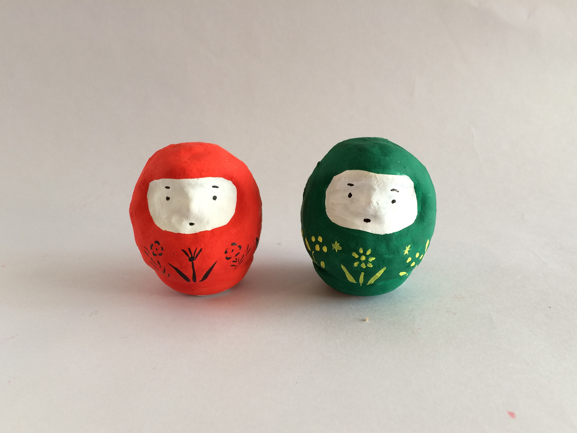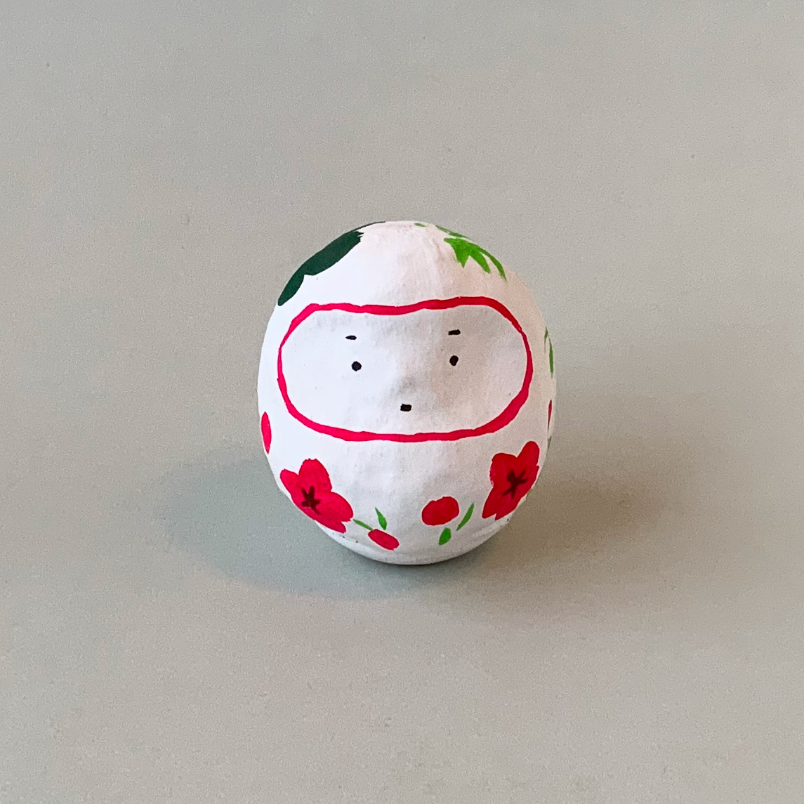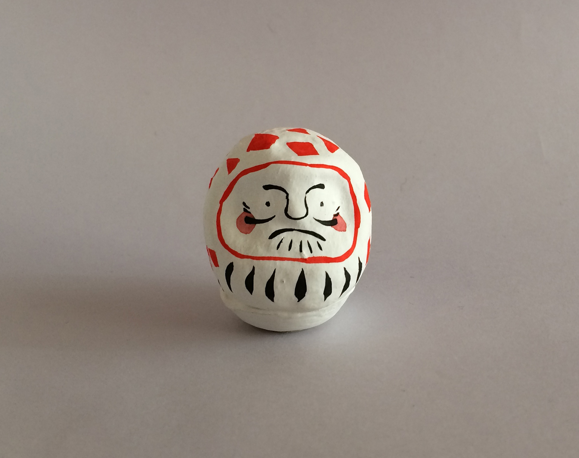張子でできている、オリジナルの絵付けのだるまです。縁日で売られるものと違い、最初から目を描き込んでいます。縁起物としてながく飾れるように、また、そばに置いて和んでいただけるように、願って作っています。