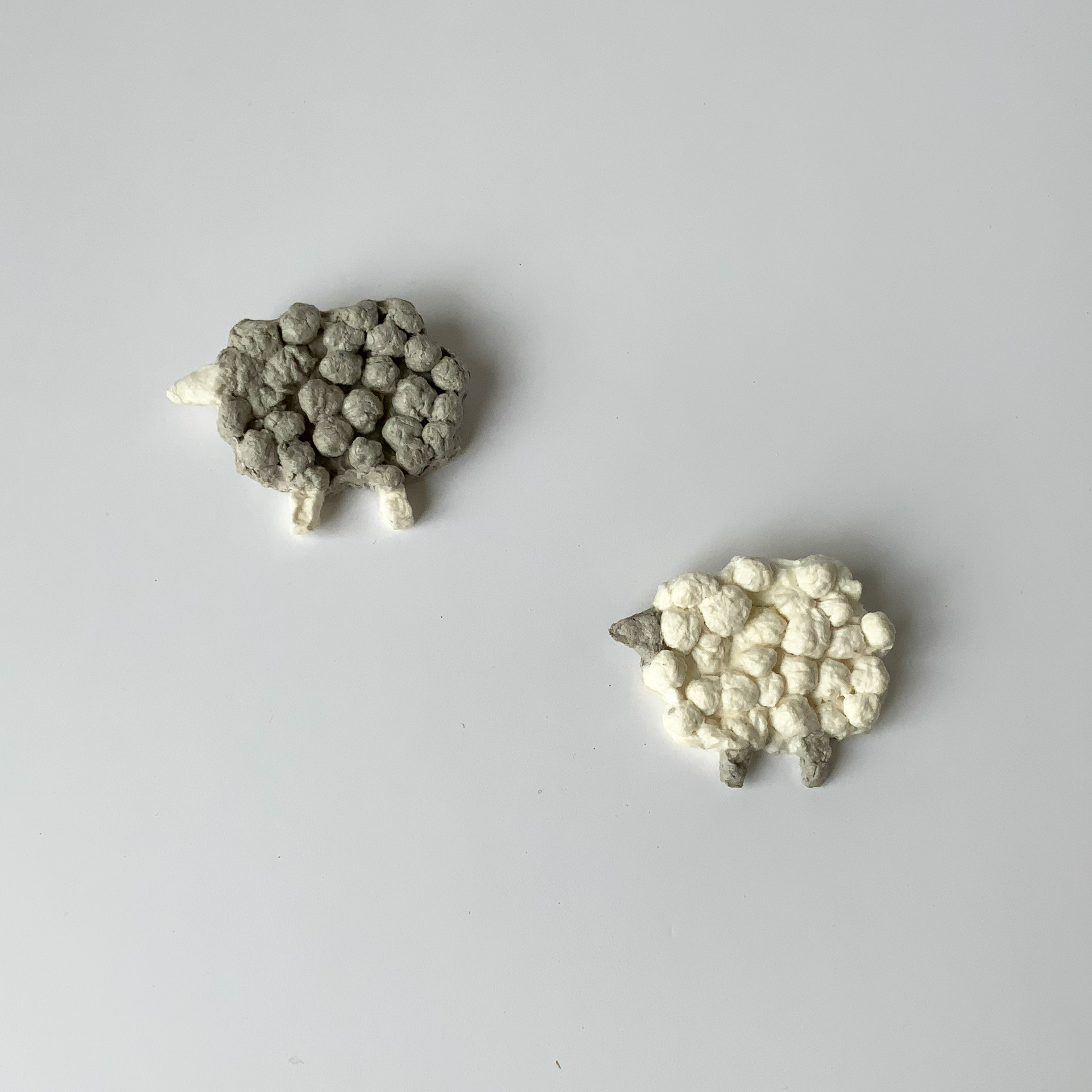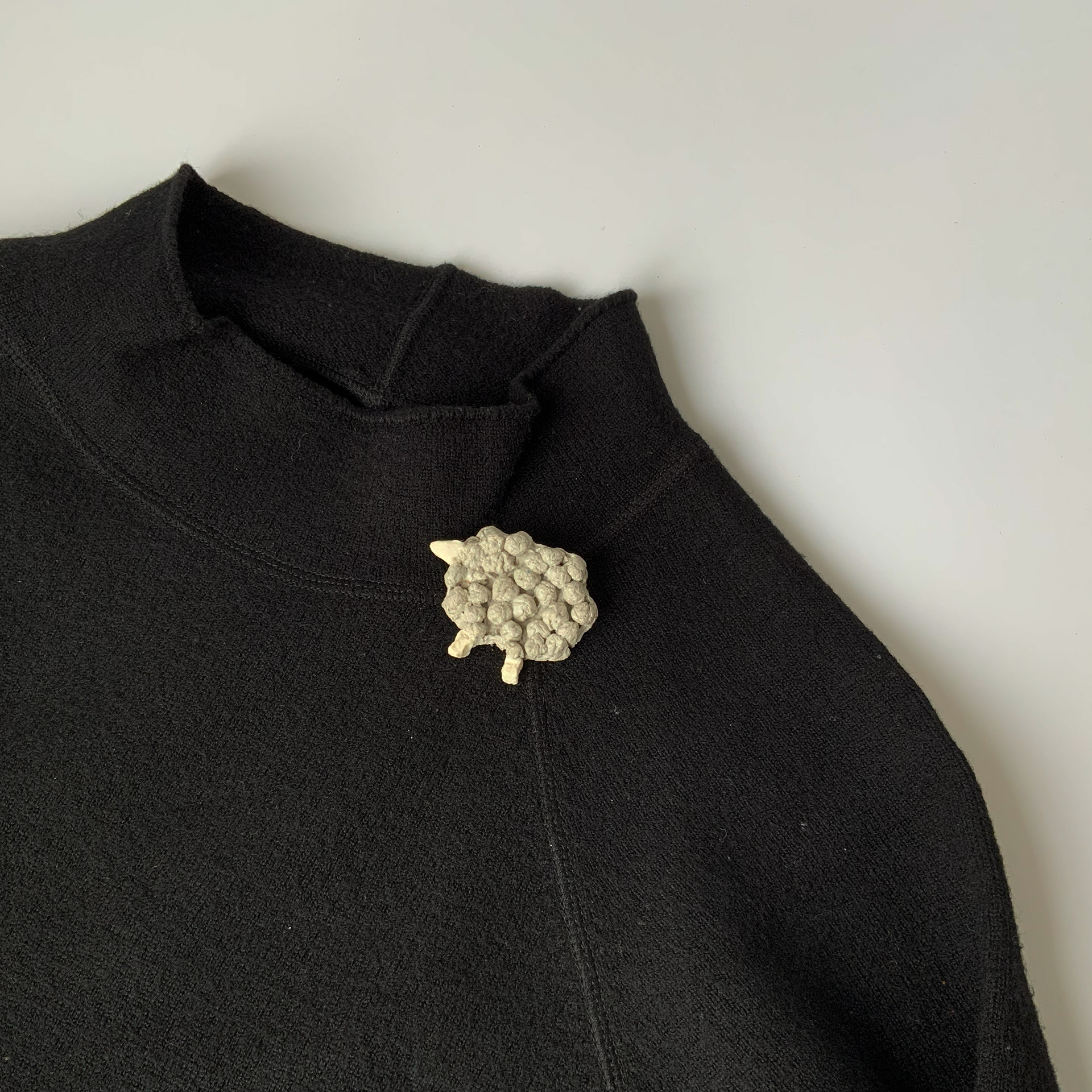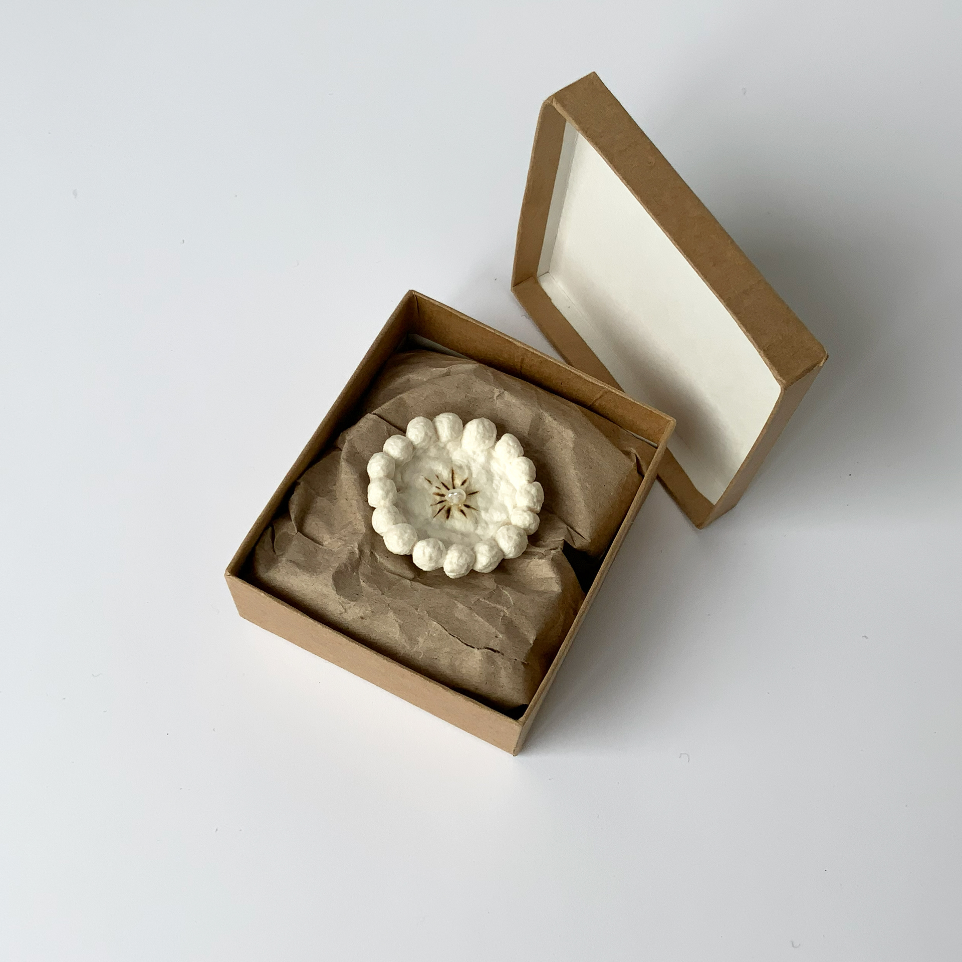 チラシや菓子箱、牛乳パックなど、身近にある紙を使った作品づくりに取り組んでいます。写真は、牛乳パックのパルプを使って作ったブローチ。つけているのを忘れるような軽さです。水濡れには弱いので、質感を活かした仕上げになる防水ニスを塗っています。