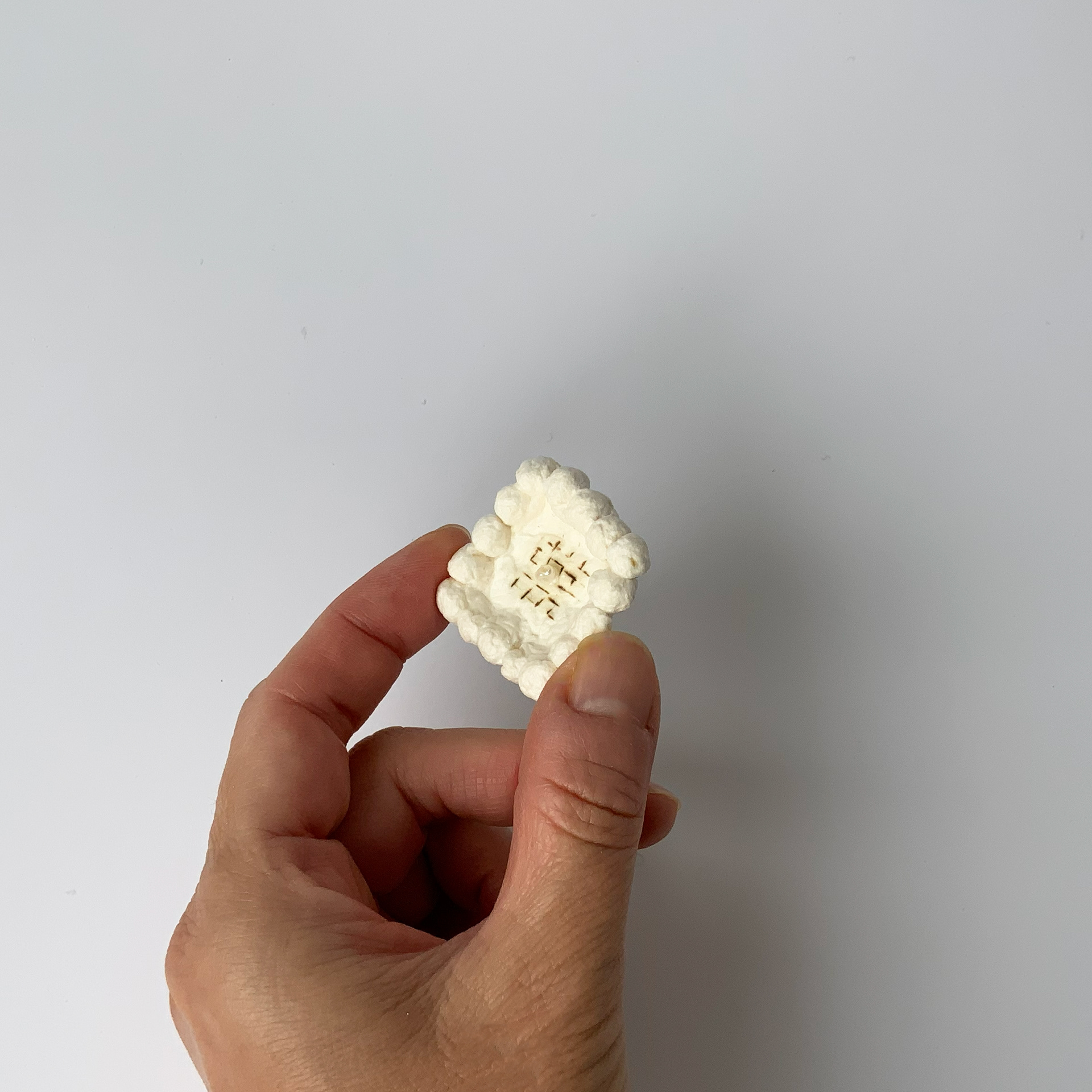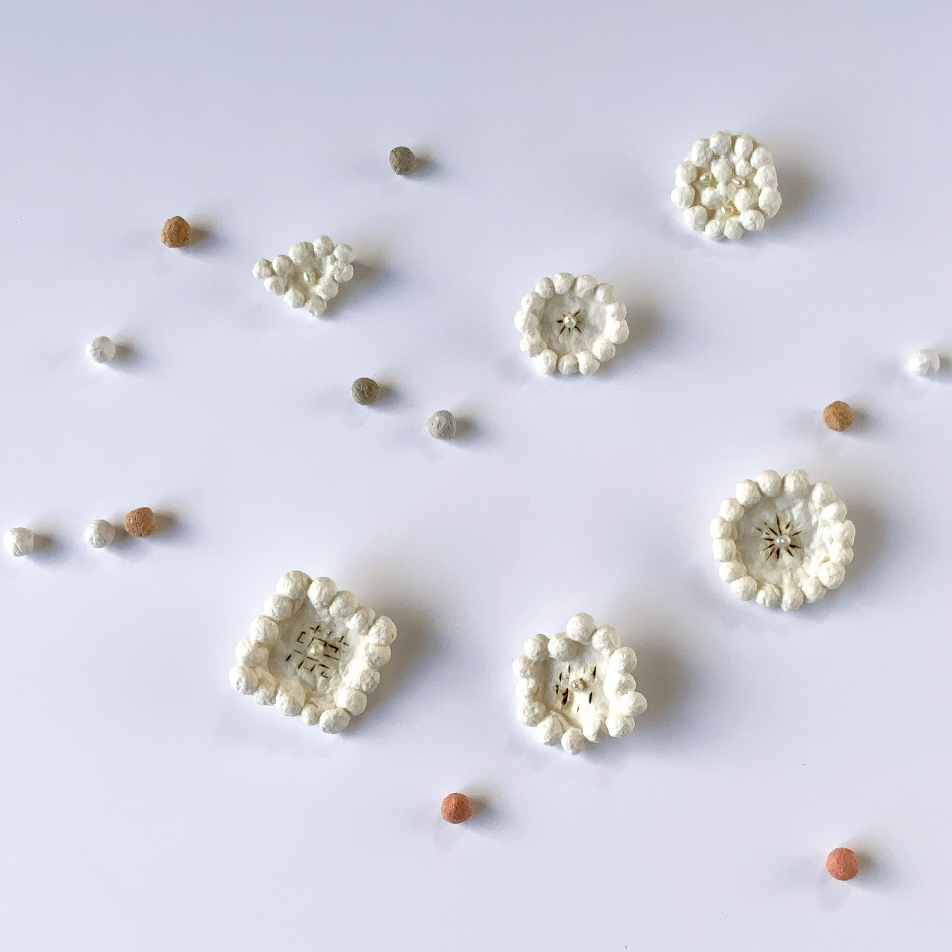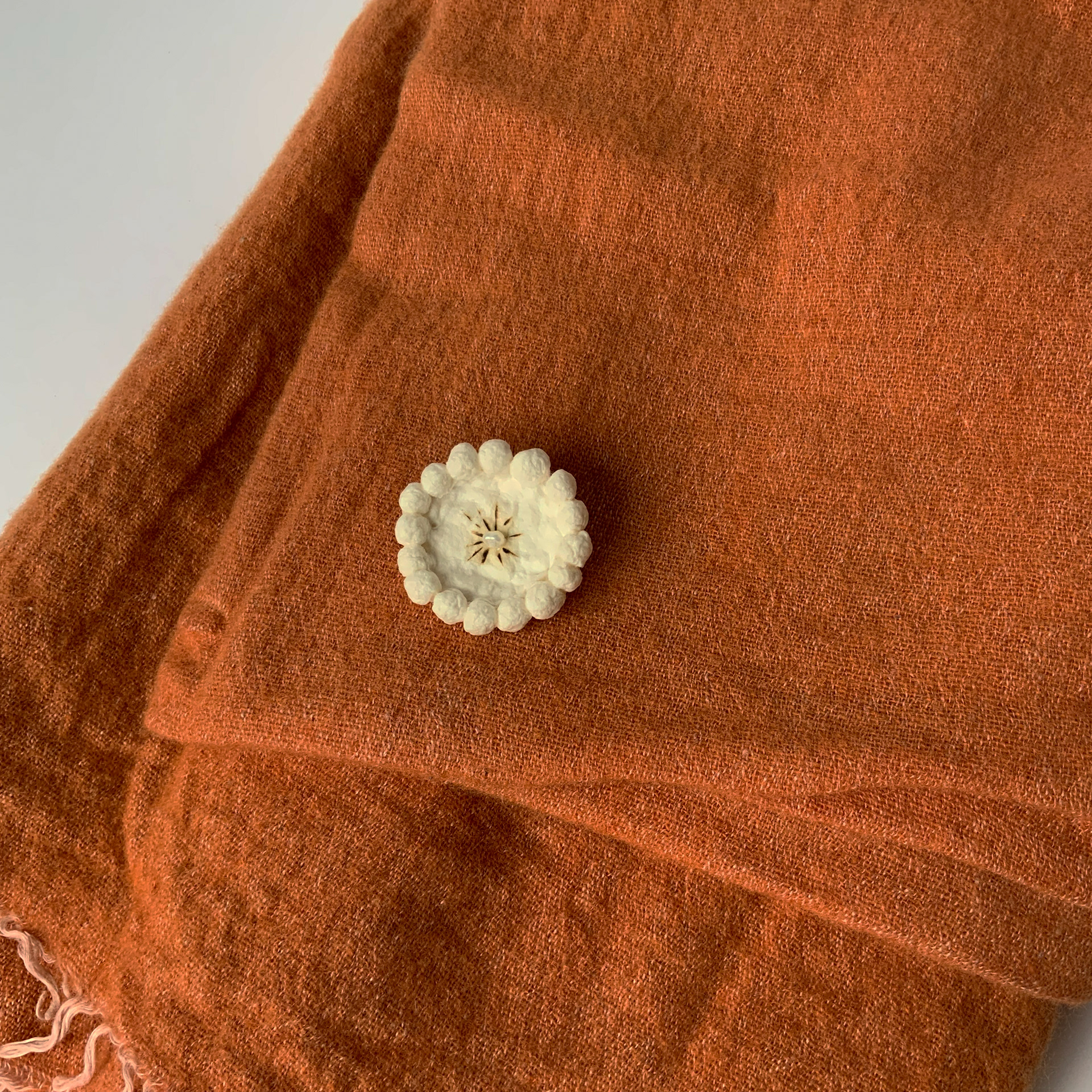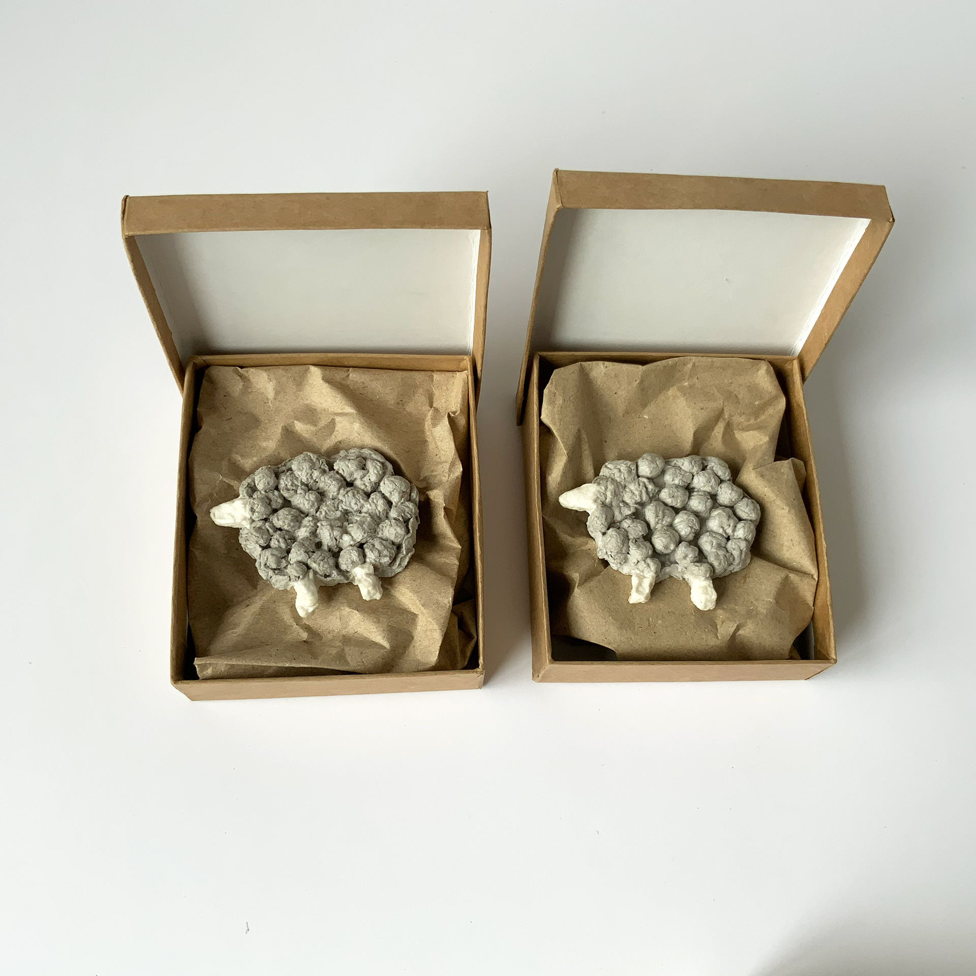 チラシや菓子箱、牛乳パックなど、身近にある紙を使った作品づくりに取り組んでいます。写真は、牛乳パックのパルプを使って作ったブローチ。つけているのを忘れるような軽さです。水濡れには弱いので、質感を活かした仕上げになる防水ニスを塗っています。