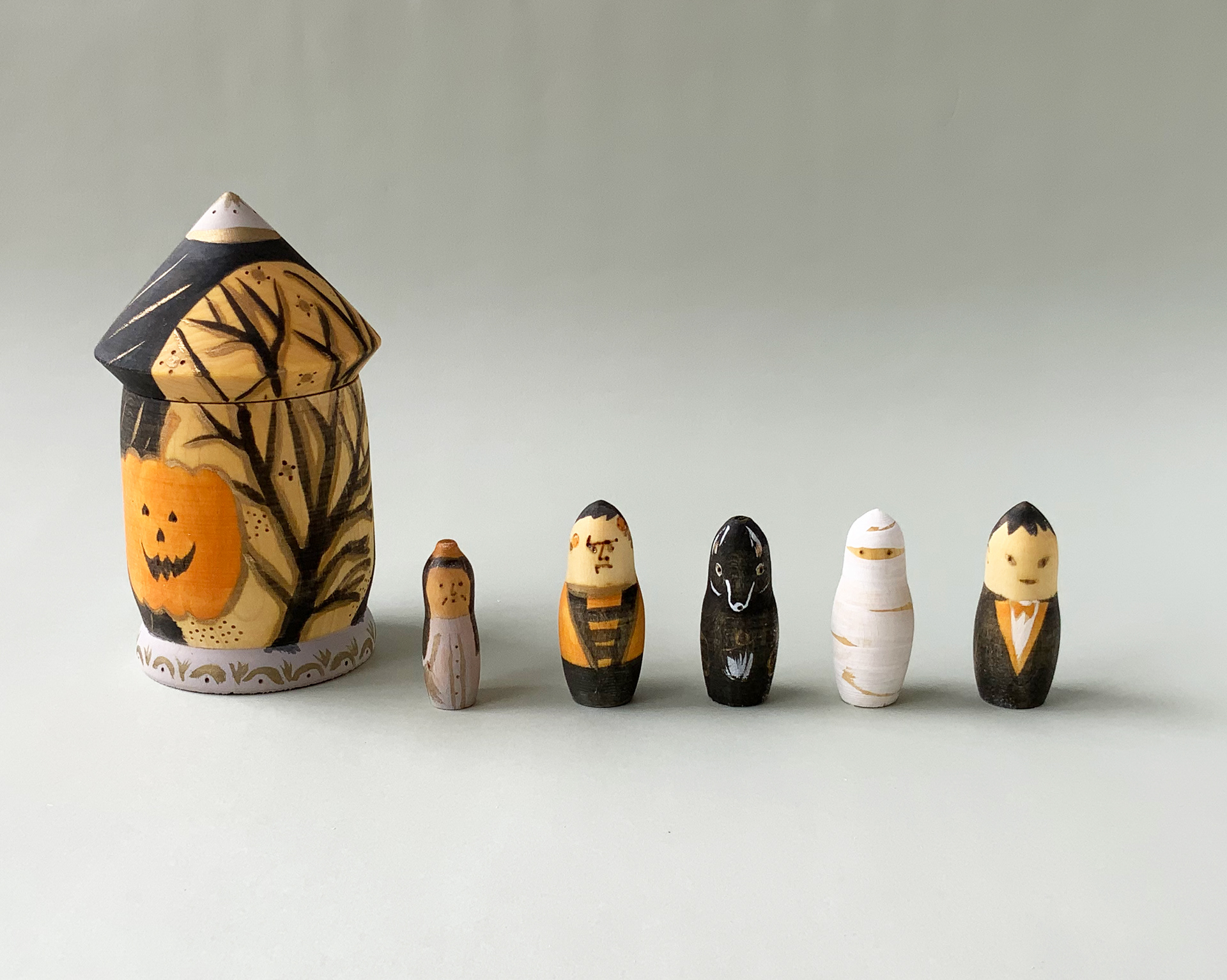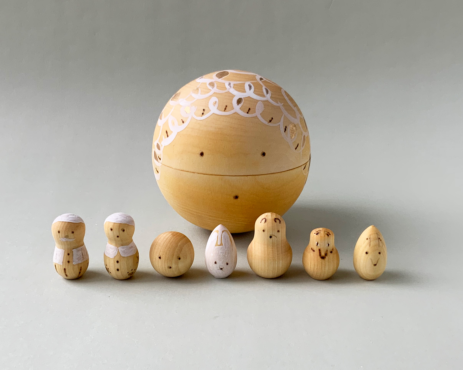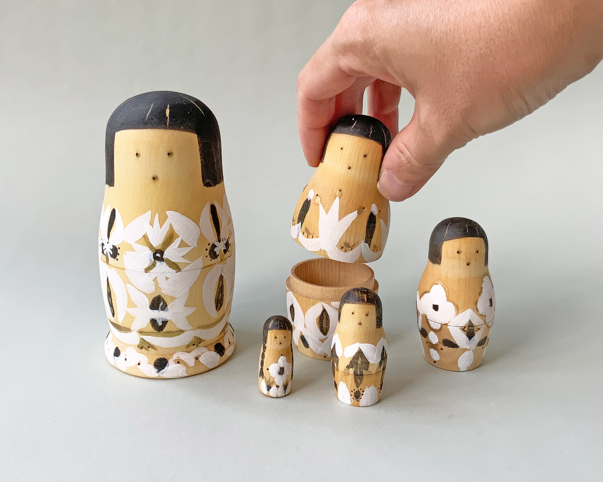 2017年からオリジナルの絵付けのマトリョーシカを作っています。おかっぱ頭の女の子の絵柄を中心に、ハロウィンやクリスマスなど、季節に合わせたマトリョーシカのほか、ロシアの昔話の登場人物が出てくるおだんごぱんなどもあります。